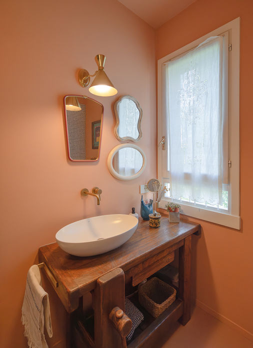 L'estro dei proprietari ha visto la sua più alta espressione nei bagni. Qui fotografato il bagno del piano terra, pensato per stupire gli ospiti con le sue tinte audaci e le superfici materiche e brillanti che contrastano con il rustico dei pezzi unici di arredi e complementi.